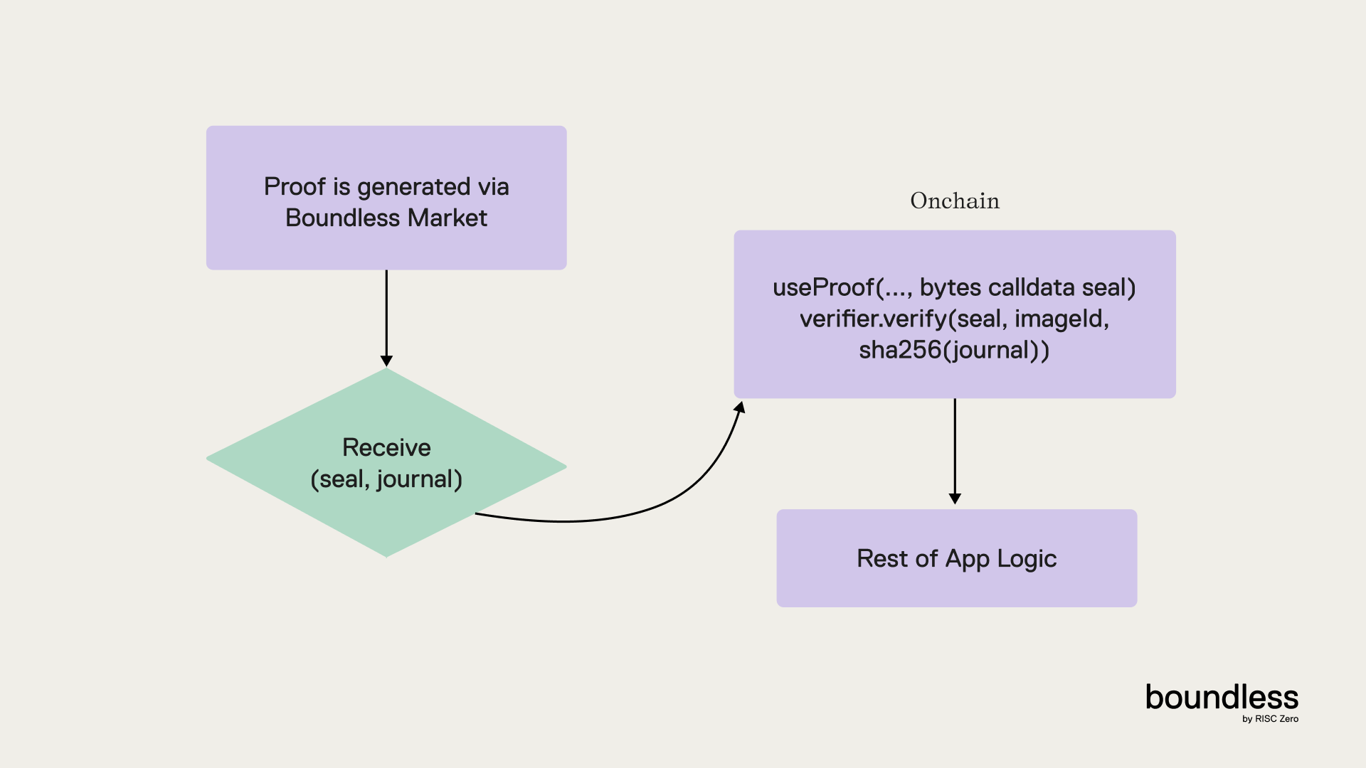 Concretely, receiving the proof (see code) from the Boundless Market returns a journal and a seal: